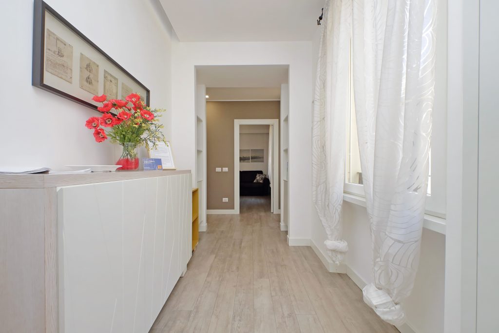 Bright and comfortable apartment in Rome’s Prati district, just a short walk from the Vatican and only 7 minutes on foot from Ottaviano metro station (line A). The apartment’s entrance opens into an airy corridor that leads guests to the various rooms of the house.